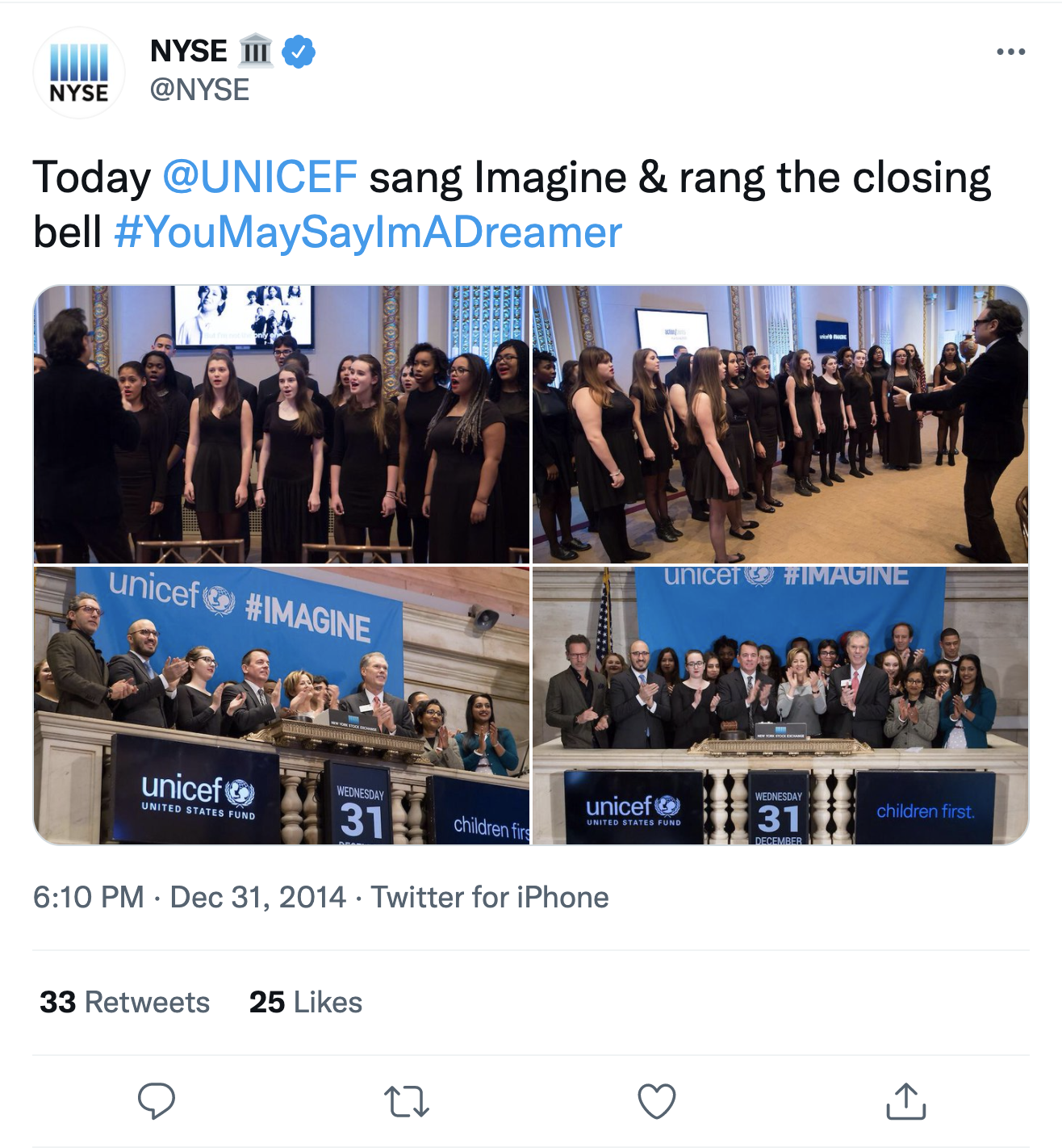 The main event itself took place on New Year’s Eve 2014, and involved children performing “Imagine” on white pianos in Cape Town, London, and Rio, and most bizarrely, a performance by a choir of teenage girls after the closing bell of the New York Stock Exchange on 31 December 2014. Spotify delivered a live stream of a set by global DJ David Guetta in Atlanta that included a screening of a montage of the “World Version” of “Imagine” with contributions submitted via the TouchCast app. As has been the tradition since, the song was performed in New York’s Times Square by the band O.A.R. in the minutes preceding midnight.